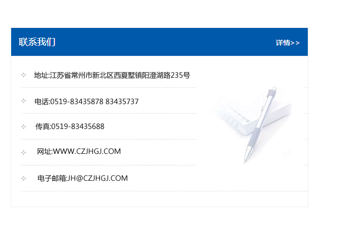 地址:常州市新北區友邦商務大廈1幢16、17層  電話:0519-85101652  傳真:0519-85112595  郵編:213022  網址:www.cz-jiayue_cn.zsxcwy.com  郵箱:xiajifengaa@163.com